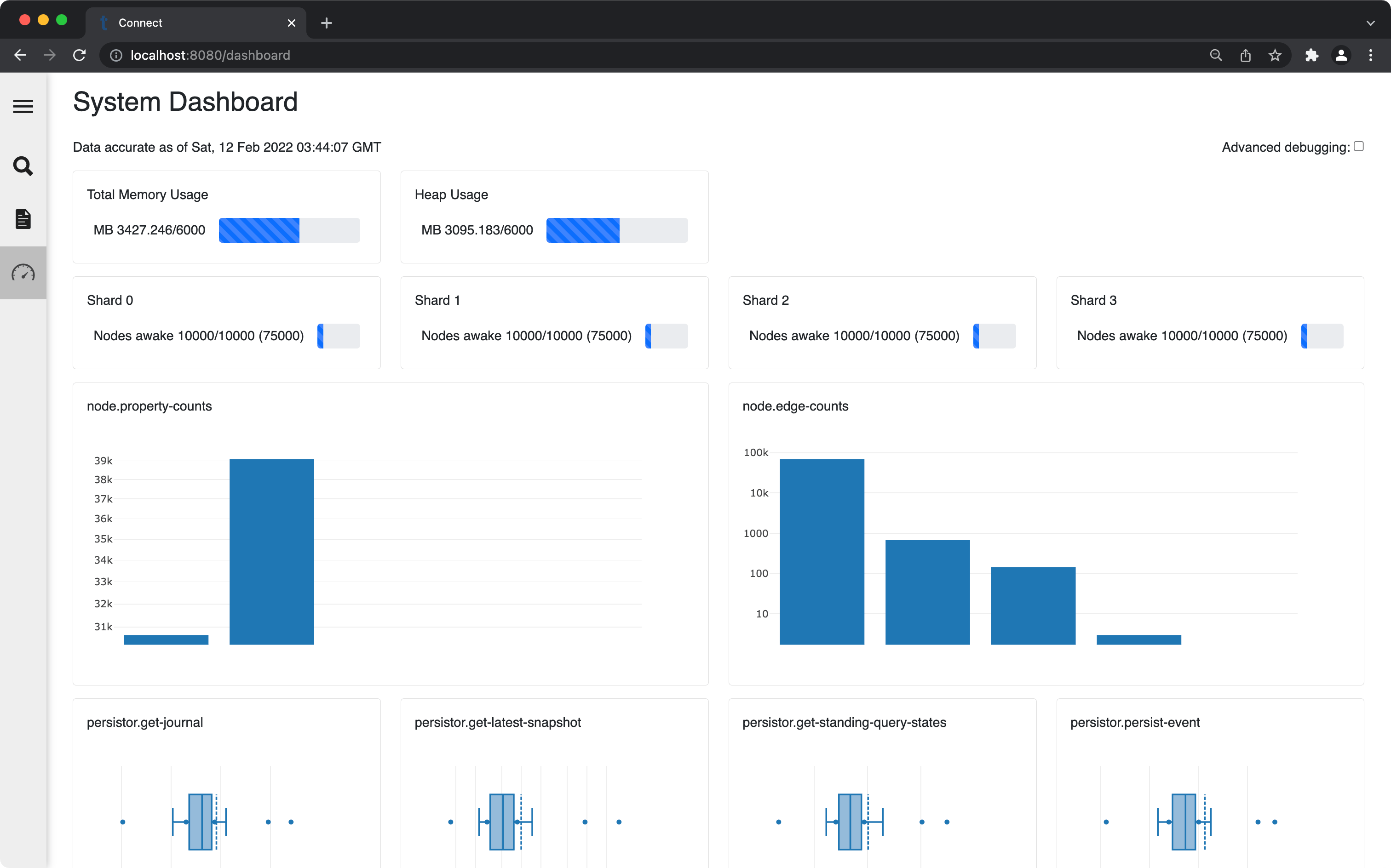 This page includes live updating reports on memory usage, nodes in the cache (per shard), basic histograms of the the number of properties and edges per node, and latency measurements of various important operations.