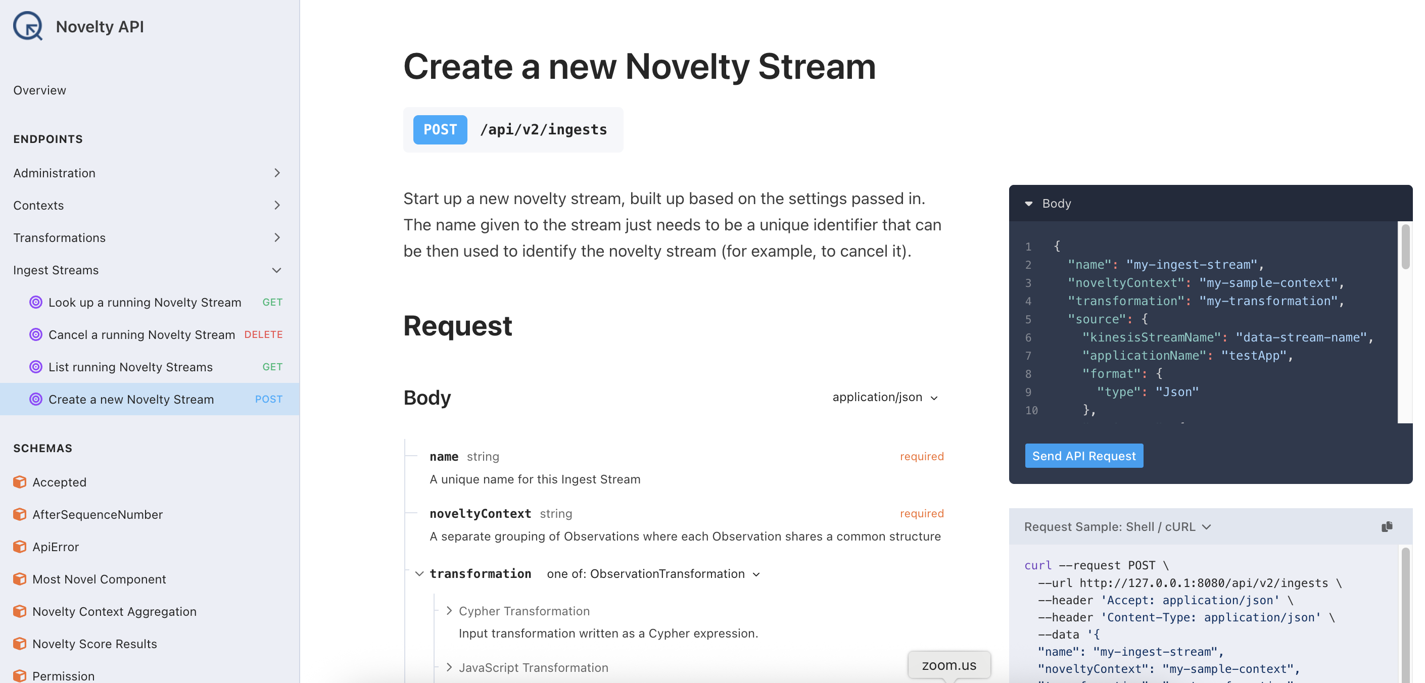 The REST API documentation is served by the Novelty web server at /docs and lists out all of the endpoints, how to call them, and some inline descriptions of what they do. The UI even makes it possible to interactively try out endpoints by filling in text fields and clicking buttons.